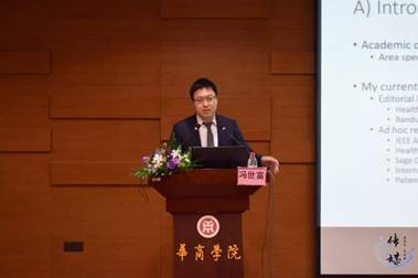 敦聘仪式结束后,冯世富博士为教师们讲授内容为“如何在SSCI/SCI期刊发表文章”的学术报告,学术报告会由王列耀副董事长主持。冯教授在讲座上首先简要解释了何为社会科学引文索引(SSCI)、科学引文索引(SCI)。