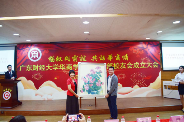 员工代表古文胜、刘秋梓、张晓媚分别向母校赠送《硕果累累》、《百花齐放》、《厚德载物》等纪念品,祝愿母校各项事业蒸蒸日上,为社会培养出更多优秀人才。