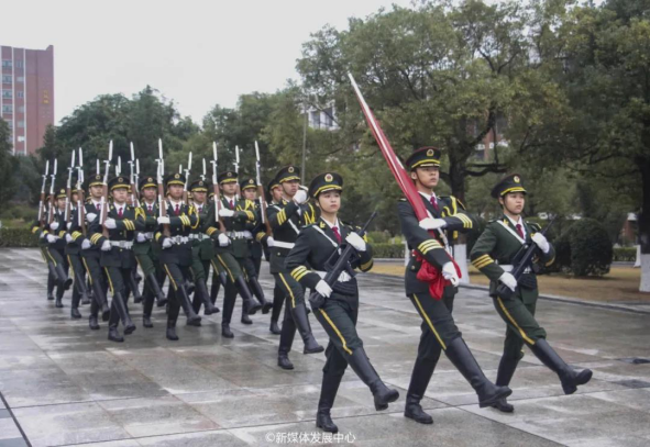 国旗护卫队的护旗手们,迈着庄严稳重的步伐,护送着国旗缓缓前行,完成庄重肃穆的出旗仪式。伴随着激昂的《义勇军进行曲》,在全体师生的注视下,五星红旗升至杆顶。