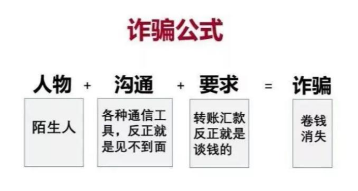 除了以上诈骗形式外,还有其他各种形式的诈骗每天伴随着我们,比如冒充QQ(微信)好友诈骗、虚构交通事故诈骗、虚假爱心传递诈骗、“猜猜我是谁”诈骗、虚假药品(保健品)诈骗、兑换积分诈骗、金融交易诈骗等等,可以说在当今这个信息化社会里,我们每天都在与诈骗分子“斗智斗勇”。通过以上案例分析,给大家归纳出了一个诈骗公式。