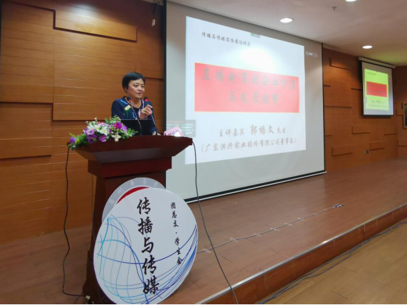 李苗教授主持讲座并且发表讲话。她对郭梧文董事长的到来表示十分感谢,希望同学们能借此机会向“粤港澳大湾区杰出青年企业家”郭梧文董事长取取经,通过了解成功人士的经验,理论与实践相结合,活学活用,更好地将传媒事业中学习到的应用到自身实践中。