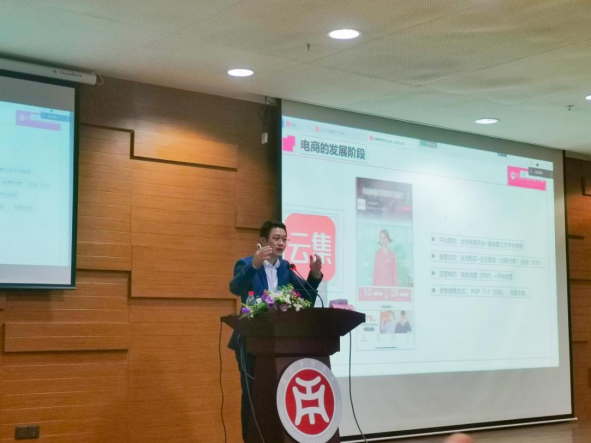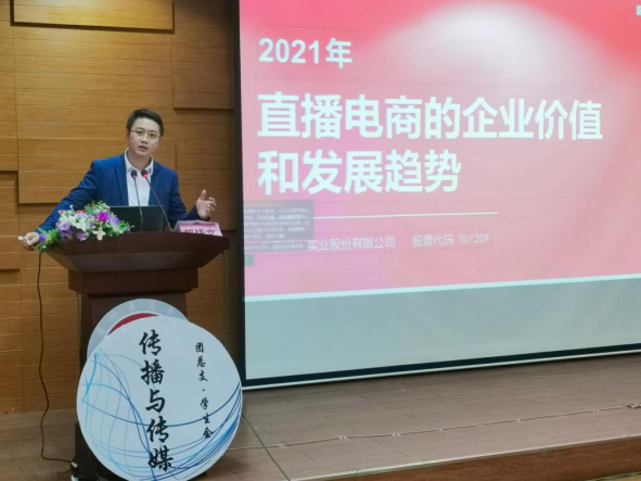 讲座伊始,郭董事长回顾自身工作经历并将此作为切入点:工作轮岗至财务部结算、电话销售、从低做起而后上升至顾问助理。直至2010年回归企业(洪兴股份)与工厂的八名员工到广州越秀区开设营销中心,实现产销分离。11年后的今天,(洪兴股份)从原来的传统工厂发展至主板上市公司,成为龙头企业,从而引出了此次讲座的主题。在正式开讲前,郭董事长与观众互动,询问大家网络消费的偏好,得出现场观众相较于直播电商更青睐传统电商。而后从“直播电商发展阶段”“直播电商对企业的品牌价值”“直播电商未来发展趋势”这三个维度进行讲述,运用天猫、拼多多、抖音等平台的平台模式、销售方式、运营模式、财务结算方式向大家讲解发展阶段的不同特点。