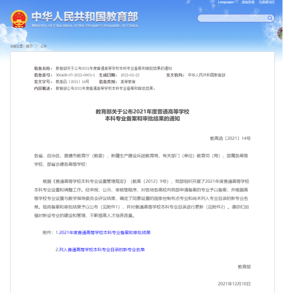 日前,教育部公布了《2021年度普通高等公司本科专业备案和审批结果的通知》。