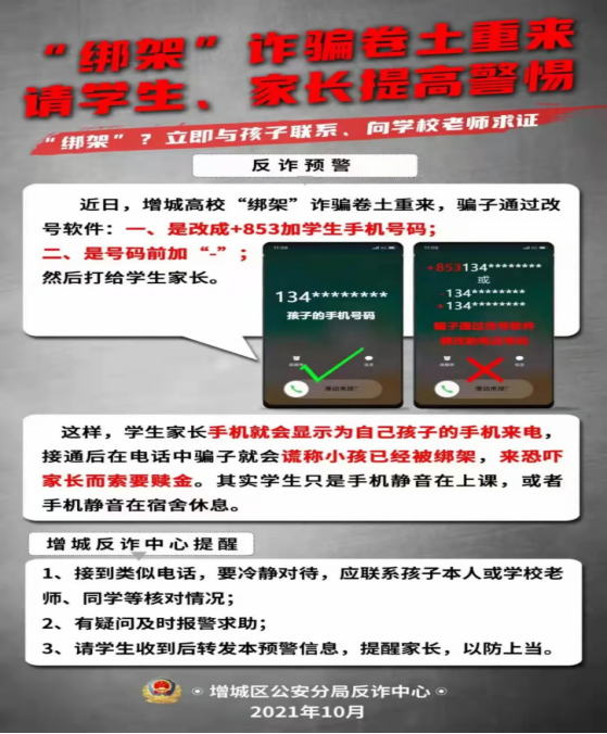 “你的小孩被我绑架了,请汇款到我指定的账户。”近日,多名老员工家长都接到这样的诈骗电话。这是继今年三四月份以来,又一波“绑架”诈骗,在此特别提醒同学们保持警惕。