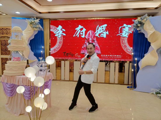 后来他看到一个视频,是一个主持人在主持婚礼。零几年的时候主持婚礼还没有在广州流行,他就意识到这是一个机会。于是他就开始吸收别人的精华,开始自己在家里写稿,写完稿子之后就开始去背,把整个流程都背下来,从交杯酒到交换戒指的每个环节都背了一百遍。为了能让自己练得更加投入,他把家人叫来扮演新婚的角色,并配合他练习整个流程。现在技能有了,应该让别人知道他会主持了,于是他就找到以前常去的广州迎宾馆的经理,说以后有主持的工作可以找他。