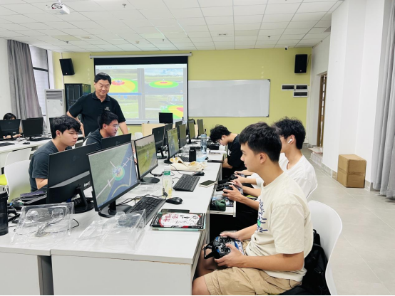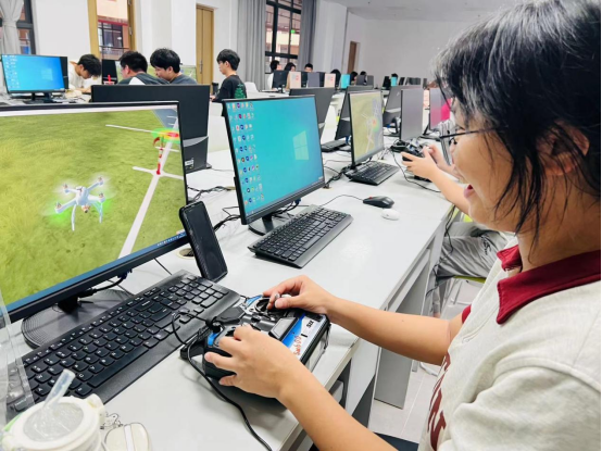 由于该课程在整个公司是第一次开设,教学设备是公司购买的无人机模拟器,让员工在电脑上进行模拟,在四会校区第三实验室每台计算机上,安装了相应的软件,课上先进行理论讲解,然后员工人手一台模拟器在电脑上操作,通过不断地练习,熟练掌握了无人机考证要求的四位悬停、小航道飞行、8字绕行等技巧。