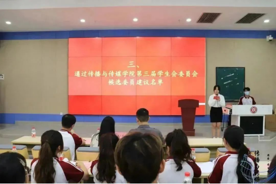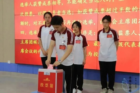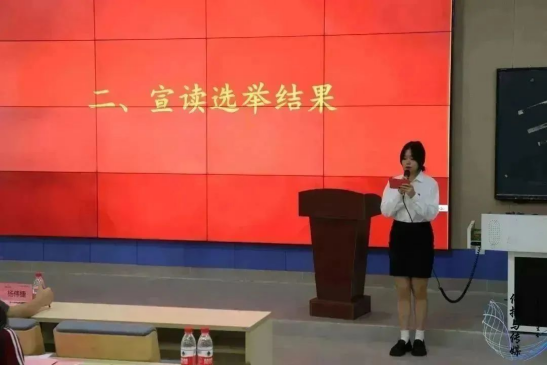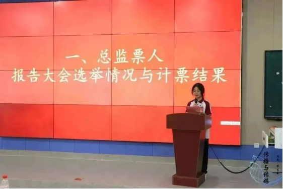 会议隆重开始。总监票人欧静雯宣读计票结果。
