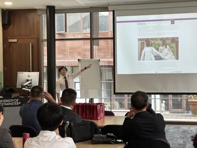 团队调研的第三站是The University of Westminster。作为伦敦新闻传播教育的重镇之一,威斯敏斯特大学在新闻、数字媒体与传播研究方面位列英国前列,拥有世界一流的媒体研究中心,员工网络遍布BBC、卫报等知名机构。参访中,院系教师MrEdgar Lee详细介绍了新闻学、数字传播等领域的最新教学与科研动向,让大家深入了解了英国一流传媒院校在新闻传播教育中的创新实践。