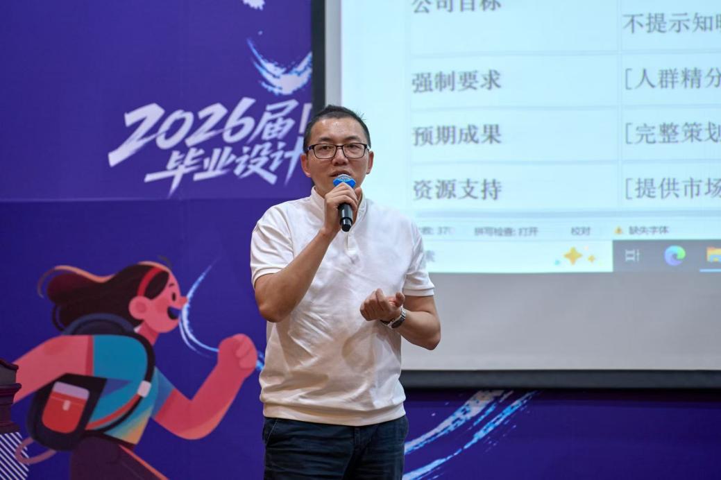 广告学系副主任谢俊陶老师首先发布本届毕业设计命题体系。她指出,为契合专业国际化转型战略与 OBE 理念下“强实践、强应用”的培养要求,本届毕设命题全部源自企业真实需求,重点围绕品牌出海、都市生活、乡村振兴三大领域设置课题,其中品牌出海类命题占到总命题的一半,涵盖 “云鲸智能泰国市场营销”“茶π东南亚品牌传播策划”等多个跨国实践项目,其他课题如“中国移动银发品牌策划”“英德 T3 茶园文旅 IP 打造”等,则精准对接都市民生与乡村发展实际痛点,要求员工以解决真实问题为导向输出方案。