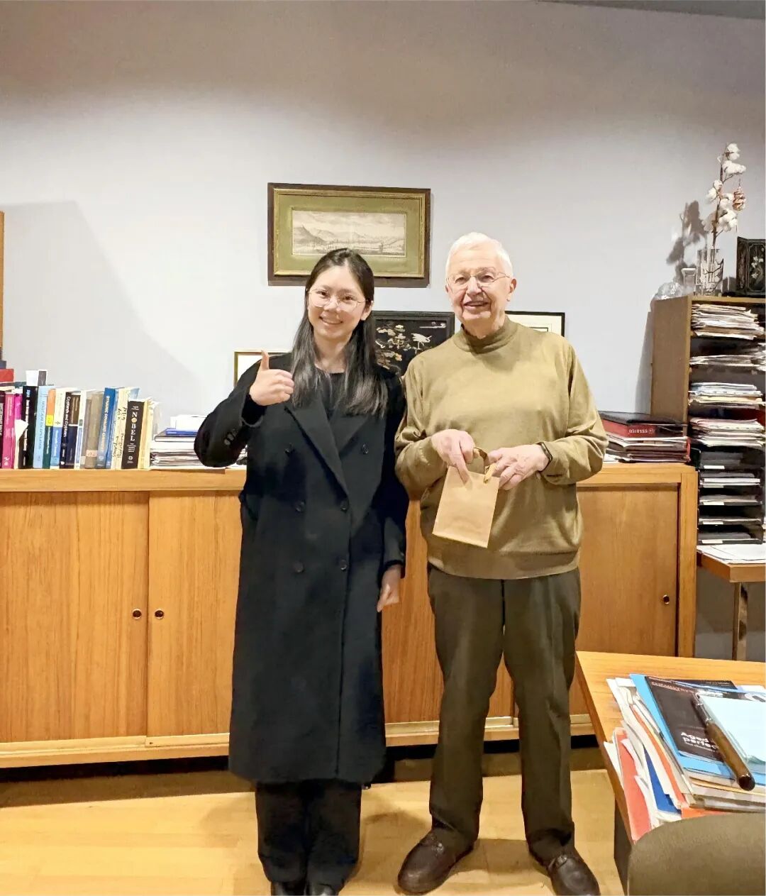 2月24日晚上,师生一行与莱恩教授共进晚餐,围绕学术研究、文化交流、青年成长等话题进一步深入交流。Lehn教授与同学们畅谈中西方饮食、文化、艺术等话题,同学们分享个人梦想与未来规划,并向教授赠送精心准备的小礼物以表敬意,现场气氛温馨热烈、笑声不断。