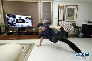 2月17日,清华大学体育部教师胡孝乾在北京家中通过腾讯会议系统为大二员工远程在线上新学期第一节男生体育课(棒球专项)时示范如何做侧面卷腹训练。新华社记者沈伯韩 摄